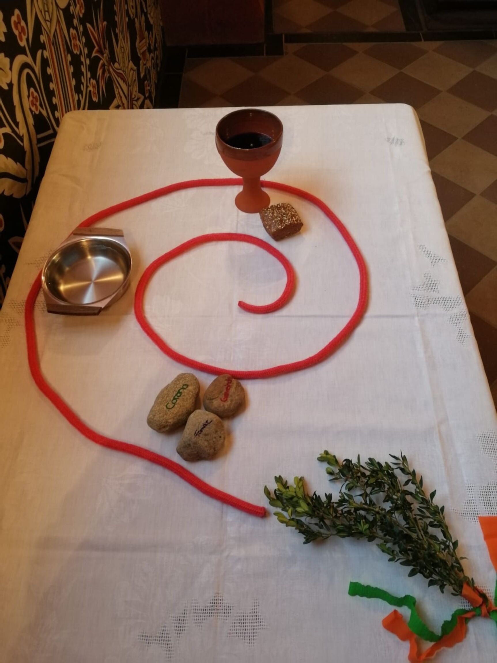 Einer spricht die alten Segensworte über Brot und Saft/Wein. Dabei nimmt er Brot und Saft/ Wein in die Hand: „Wie dieses Brot, aus vielen Körnern bereitet, jetzt ein Brot ist, und wie dieser Wein/Saft, aus vielen Beeren gewonnen, jetzt ein Trank ist, so will Gott Menschen zueinander führen, in dieser Gemeinschaft und auf der ganzen Welt. Kommt, und esst von diesem Brot, das uns eint! Jesus, der Herr, gebe uns seinen Frieden.“