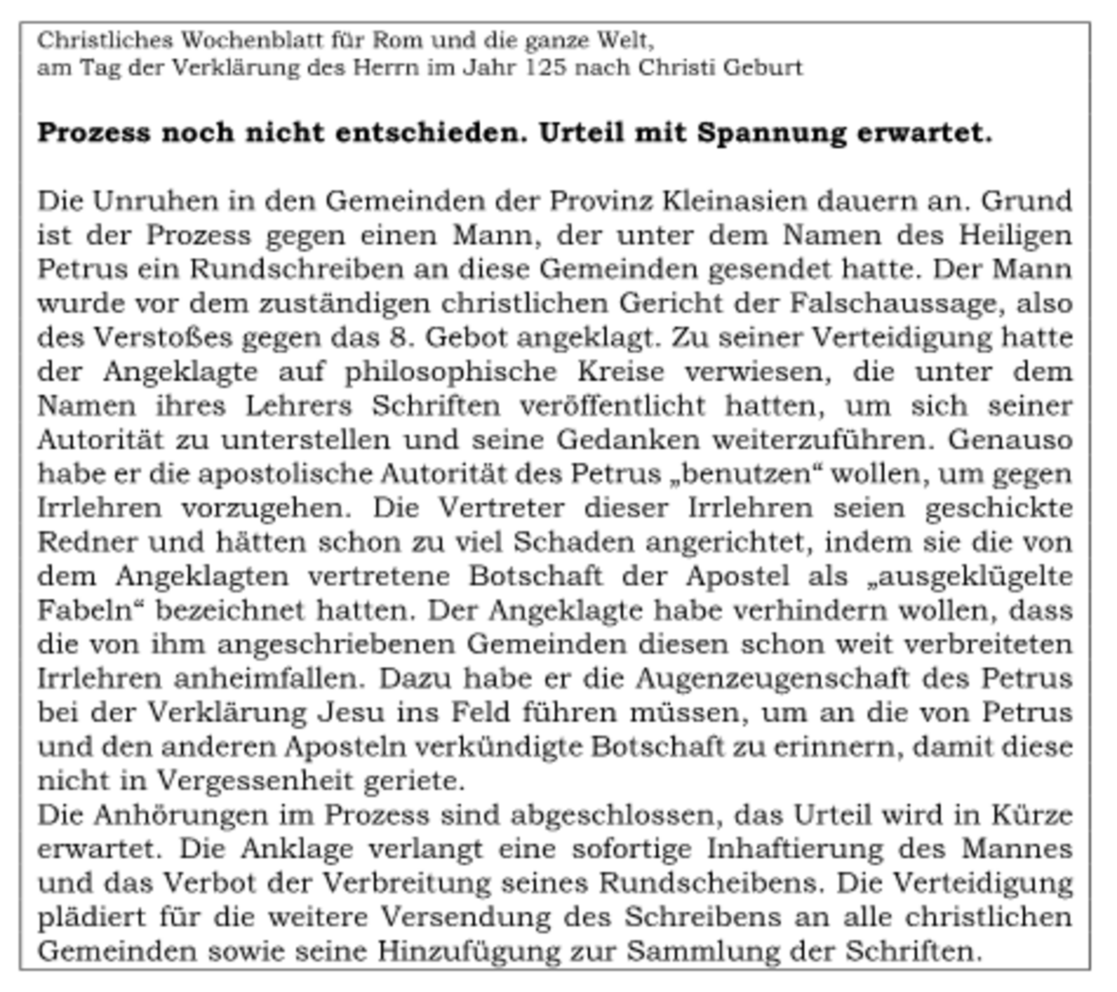 Eine Falschaussage ist auch heute noch kein Kavaliersdelikt. Dennoch wurde dem 2. Petrusbrief sein Platz im Neuen Testament zugestanden. Das liegt daran, dass das Verfassen einer Schrift unter dem Namen einer bekannten Autorität wie Petrus im 2. Jahrhundert nach Christus ein gängiges Stilmittel war. Der Verfasser des 2. Petrusbriefes betrachtet sich als Botschafter des Evangeliums von Jesus Christus, als er in dem Brief dieses Stilmittel einsetzt. Aus dem Brief stammt der Text, der für den heutigen Sonntag vorgesehen ist: