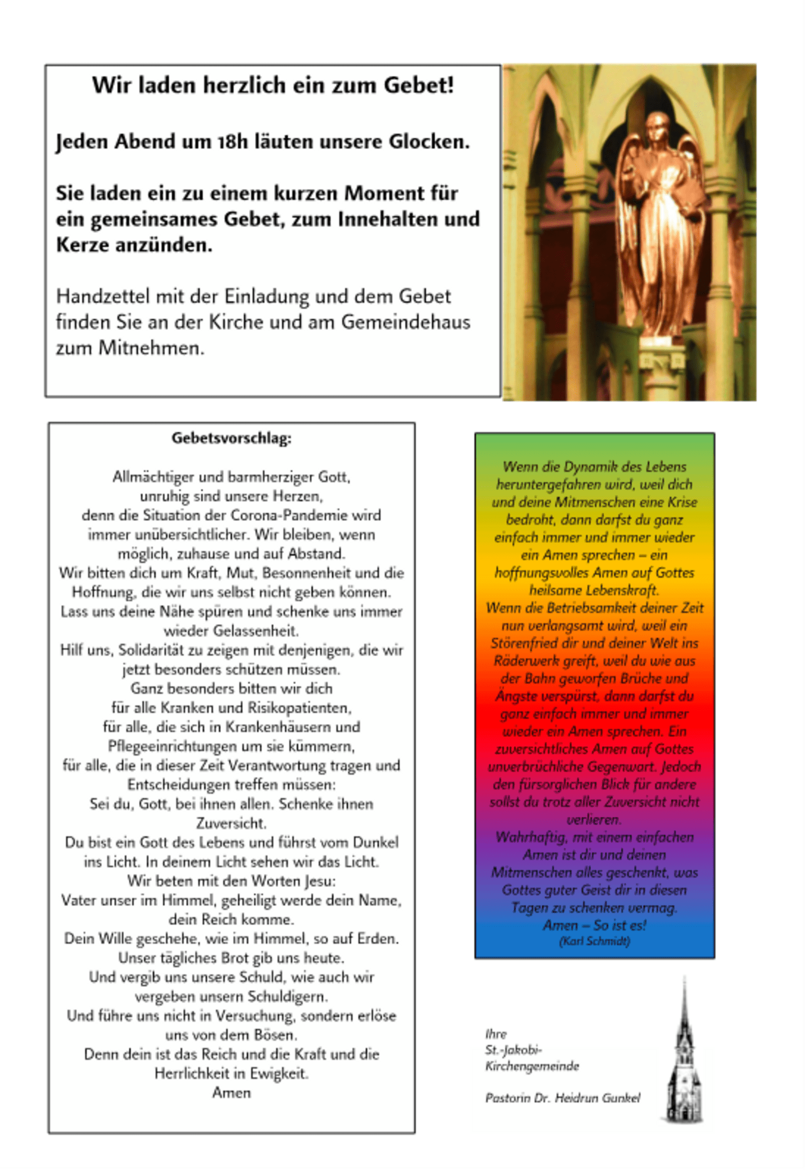Seit heute befinden wir uns im 2. corona-bedingten Lockdown (light). Deshalb bekräftigen wir noch einmal die Einladung zum gemeinsamen Gebet: